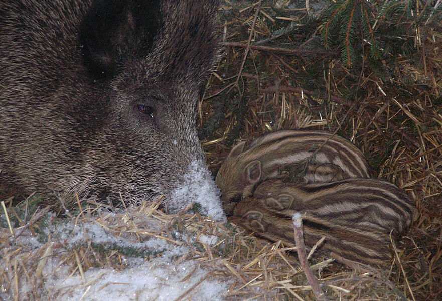 Nach einer Tragezeit von 15–17 Wochen, gebärt die Bache 3-9 Frischlinge. Für den Wurf polstert die Bache ein Lager gut mit Moos oder Farnkraut aus. Mit ca. 4 Jahren sind die Frischlinge ausgewachsen.