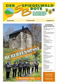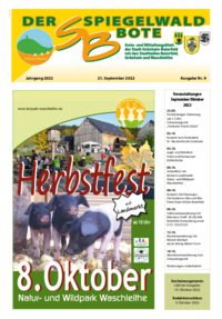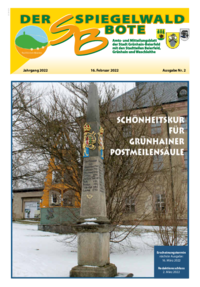 Der Spiegelwaldbote für öffentliche Bekanntmachungen und Mitteilungen der Stadt Grünhain-Beierfeld erscheint monatlich. Unternehmen, Institutionen und Vereine haben die Möglichkeit, Informationen zu veröffentlichen. Anzeigen, Veranstaltungshinweise und allgemeine Informationen runden das Angebot ab.
