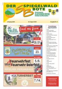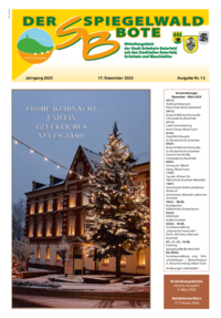 Der Spiegelwaldbote für öffentliche Bekanntmachungen und Mitteilungen der Stadt Grünhain-Beierfeld erscheint monatlich. Unternehmen, Institutionen und Vereine haben die Möglichkeit, Informationen zu veröffentlichen. Anzeigen, Veranstaltungshinweise und allgemeine Informationen runden das Angebot ab.